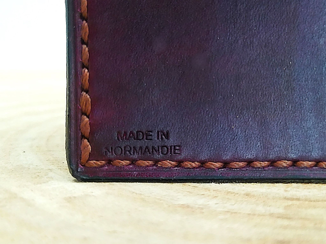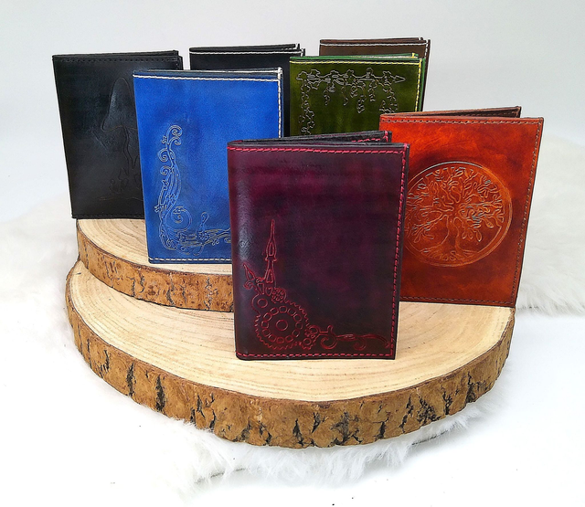 L'extérieur est en cuir de vachette de tannage végétal sur lequel j'ai apposé un motif, réhaussé par une teinture sélective. L'intérieur est en cuir de chèvre ou de vachette. J'ai réalisé la couture en point sellier, et la finition de tranche traditionnelle en bord franc.