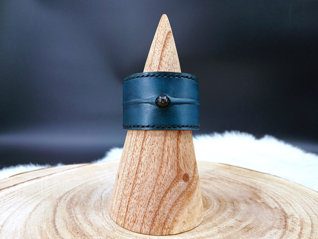 La manchette est incrustée d'une obsidienne dorée, maintenue par un fil métallique mis en relief. Le cuir extérieur est teint manuellement avec une teinture à base d'eau recouverte ensuite d'une finition satinée.
