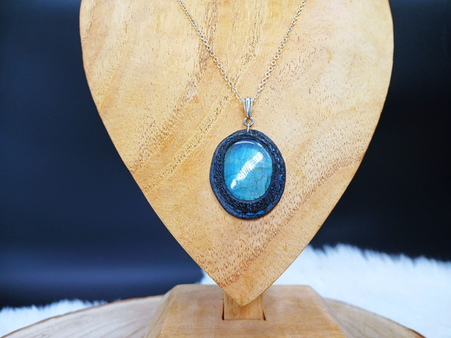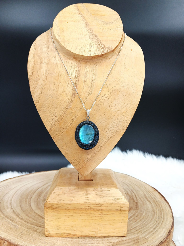 Ràn est un pendentif en cuir et labradorite, fait à la main à la mesure de la pierre et dans le respect de la tradition artisanale et des critères de qualité haut de gamme.
