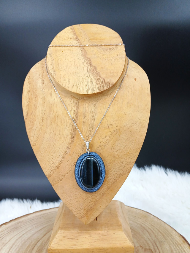 Sedna, pendentif en œil de tigre bleu et cuir