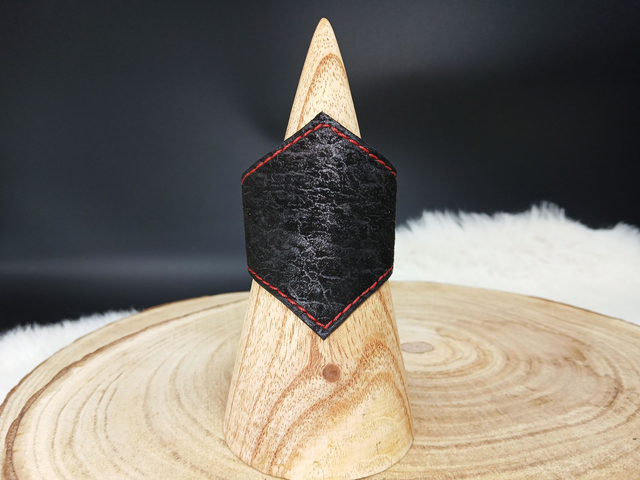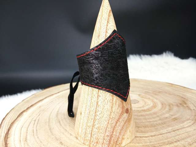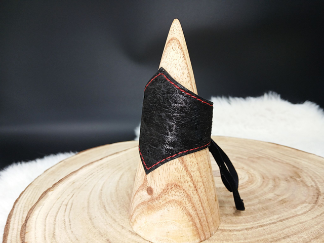 Cuir de chèvre velours à imprimé métallisé. La doublure est en cuir de vachette de tannage naturel végétal, aucune teinture ni finition n'est appliquée afin d'éviter les allergies par le contact avec la peau. Elle sera amenée à se patiner avec le temps.