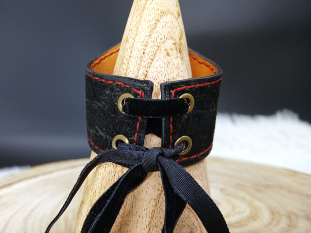 Couture manuelle, finition de tranche en bord franc teinté à la main, œillets posés à la main.