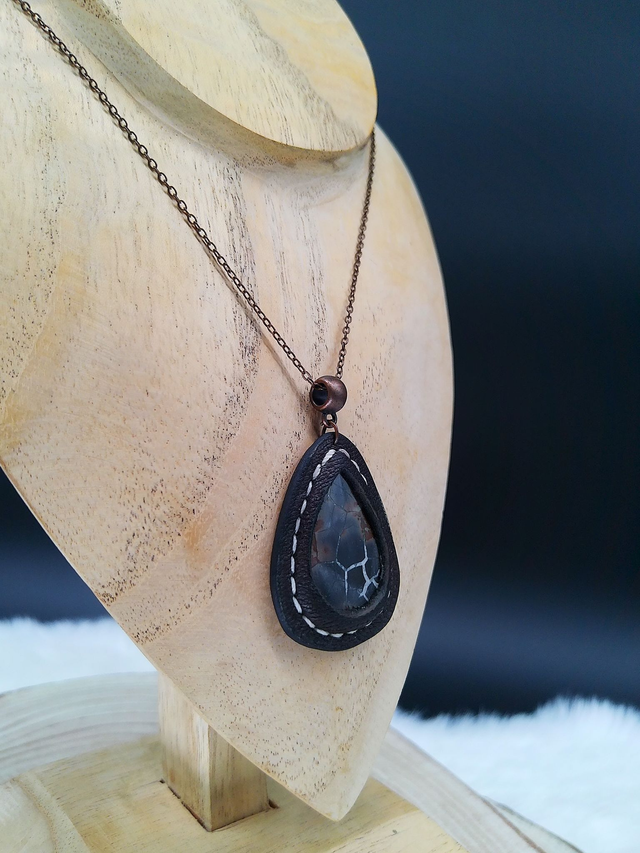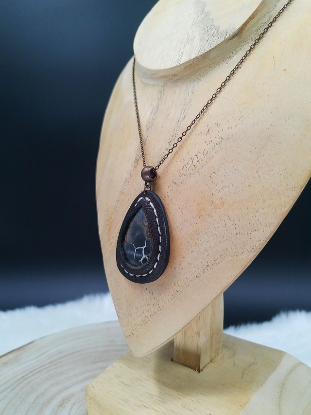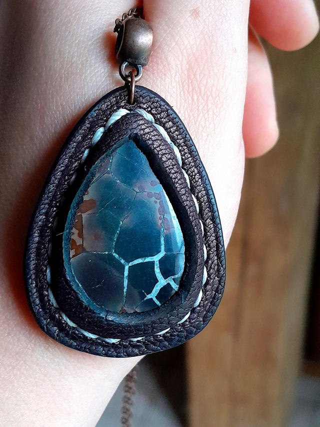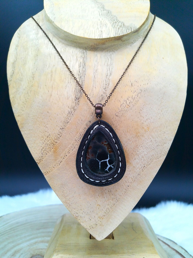 Gaïa est un pendentif en cuir et septaria, fait à la main à la mesure de la pierre et dans le respect de la tradition artisanale et des critères de qualité haut de gamme.
