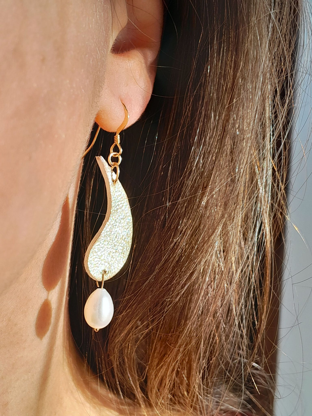 Collection Halley, boucles d'oreilles en cuir, pierres naturelles ou coquillages, et acier inoxydable plaqué argent ou gold filled.